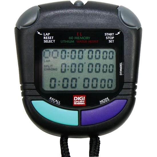 Die Digi Sport Stoppuhr „PC-91-EL 60 Memory“ ist der perfekte Zeitnehmer für das Training mit Gruppen. Denn dieses Uhr zeigt die schnellsten, langsamsten und durchschnittlichen Rundenzeiten an. Damit Sie die „PC-91-EL 60 Memory“ von Digi Sport nicht die ganze Zeit in der Hand halten müssen, ist ein praktischer Clipper an der Uhr befestigt. Zudem verfügt der Zeitnehmer über eine Nachtlichtfunktion und ein Druckpunktsystem, welcher eine fehlerfreie Messung garantiert.