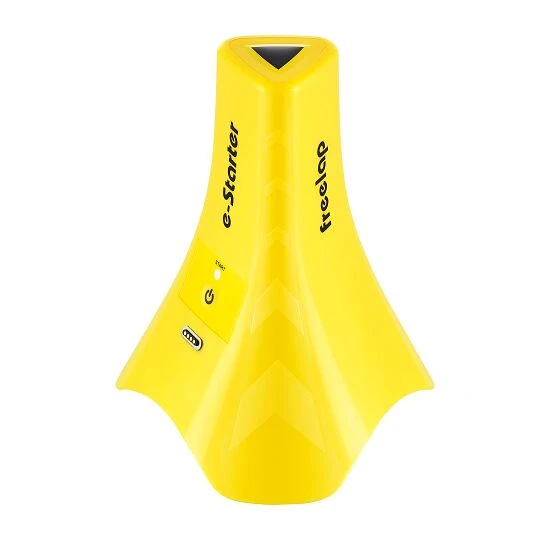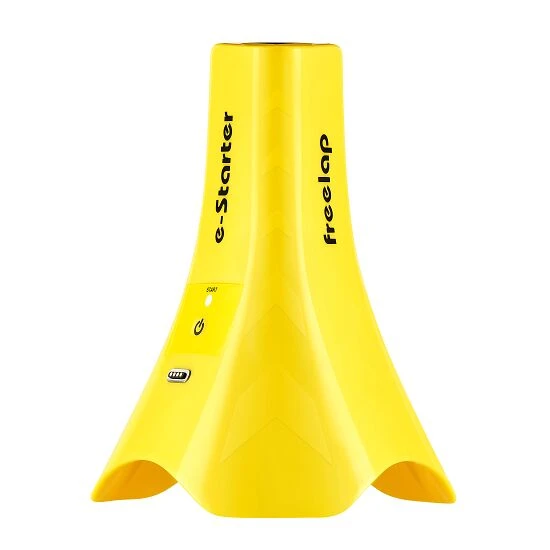 Der Freelap Transmitter „e-Starter“ verfügt über einen Lautsprecher, der nach dem Drücken des Start-Knopfes das Startkommando („Set“) sowie den anschließenden „Startschuss“ wiedergibt. Die Zeitspanne zwischen „Set“ und dem Startsignal ist dabei stets unterschiedlich (1,5–2,5 Sek.), sodass Sie Gewöhnungseffekte vermeiden und stattdessen die Wettkampf-Realität bestmöglich simulieren. Für das Tool ist es dabei unerheblich, ob Sie einen Tief- oder Standstart durchführen. Der Transmitter ist kabellos per Akku einsetz- und via USB-Kabel wiederaufladbar.