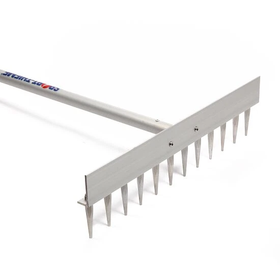 Dank der Harke mit Schieber „Pro“ von Sport-Thieme ist die Sprunggrube schnell hergerichtet. Hochwertiges AluminiumAluminium ist ein korrosionsbeständiges und pflegeleichtes Leichtmetall, welches für den vielfältigen Einsatz im Innen- und Außenbereich geeignet ist. Aufgrund der hohen Elastizität und des nur geringen Gewichts, ist es eines der am häufigsten verwendeten Gebrauchsmaterialien. sorgt für Stabilität und erleichtert das Ebnen der Sprunggrube. Die spitzen Zinken der 56 cm breiten Harke ermöglichen ein leichtes Ziehen durch den Sand, während die obere Seite zum Abziehen und Planieren geeignet ist. Testen Sie es aus: Einmal mit diesem Hilfsmittel geharkt, kommt kein anderes mehr infrage.