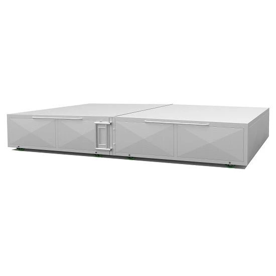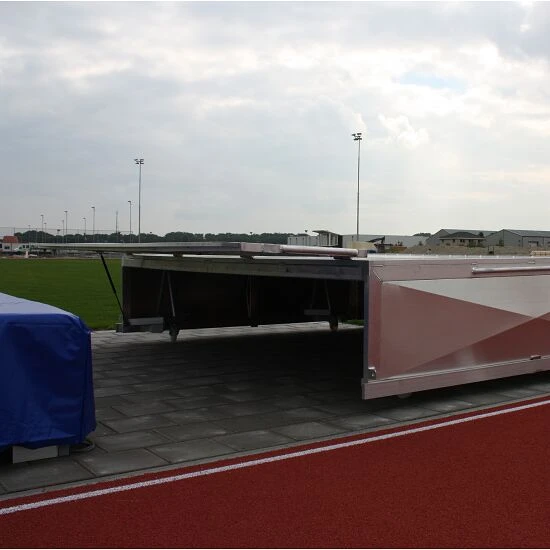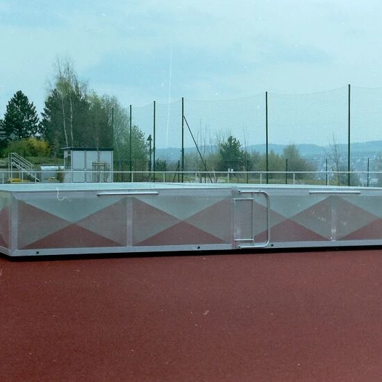 Die fahrbare Hochsprungkissen-Abdeckung hat eine geschlossene Alu-Ganzkonstruktion. Die Dachflächen sind aus Bordwandprofilen auf Alurahmen gefertigt, die Seitenflächen aus Alu-Kassetten. Hiermit schützen Sie Ihre Anlage vor Witterungseinflüssen (z.B. permanenter Sonneneinstrahlung) und mutwilliger Beschädigung. Die fahrbare Abdeckung besteht aus 2 Teilen. Diese werden mittels Spannhebelverschluss fest zusammengedrückt. Die Abdeckung ist wasserabweisend, nicht wasserdicht, daher ist eine Regenhaube zu empfehlen.