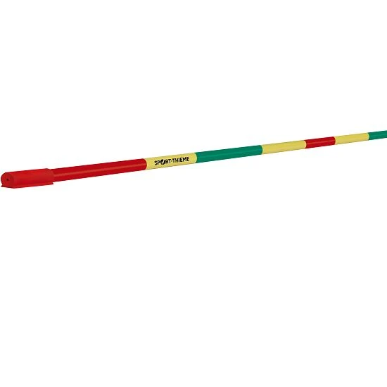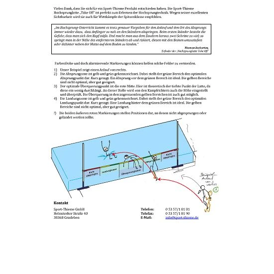 Die Sport-Thieme Hochsprunglatte „Take Off“ mit farbigem Latten-Design wurde von Thomas Zacharias, Deutschlands Hochsprunglehrer Nr.1, entwickelt. Auf der Sprunglatte sind verschiedene Zonen farbig markiert, um den bestmöglichen Absprung zu erreichen. Die roten Zonen signalisieren: Hier auf keinen Fall abspringen! – Es droht der Zusammenstoß mit einem der Ständer oder die Landung neben der Matte. Der Absprung sollte in der grünen Zone stattfinden, um optimal in der Mitte auf der Weichbodenmatte zu landen.