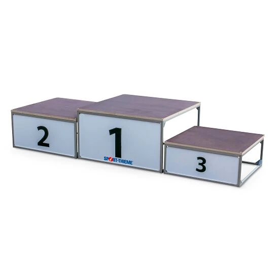Das Sport-Thieme Siegerpodest für Teams ist eine neue, vergrößerte Variante herkömmlicher Siegerpodeste. Dank der besonders großen Standflächen bietet das Podest Platz für 4 bis 5 Personen und eignet sich so ideal für diverse Teamsportarten. Das Treppchen ist durch sein robustes Aluminiumgestell belastbar bis 400 kg. Auf den rutschsicheren Standflächen aus Siebdruckplatten haben die Sieger auch bei Regen einen sicheren Stand. Das Besondere: Dieses Siegertreppchen besteht aus 3 Elementen, die Sie platzsparend stapeln und gut transportieren können.